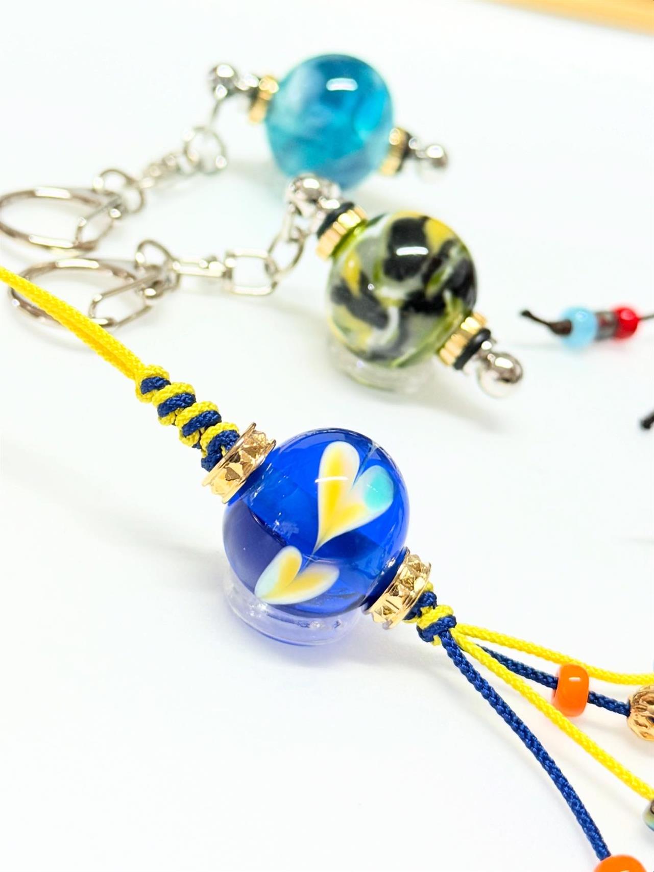 城崎温泉の「カニカニツアー」で旅行中とのことで、旅の思い出にと出来上がったとんぼ玉はストラップやネックレスにお化粧してあげて、世界に一つの想い玉が完成❣️