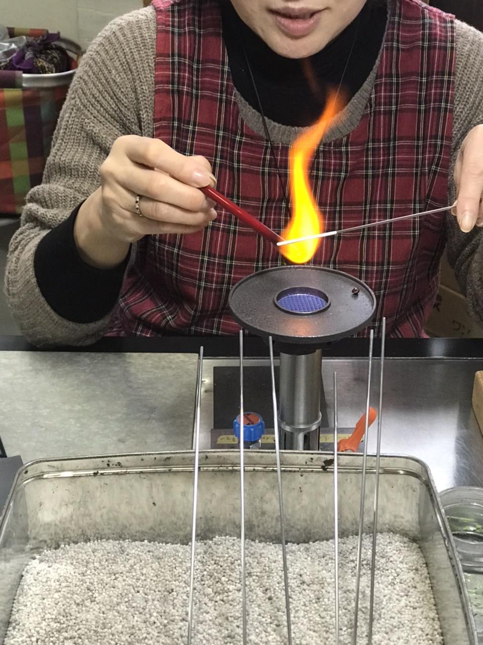 とんぼ玉の体験といえばステンレス棒にガラスを巻き付けて、冷めたら抜く。穴が出来て色んなものに作れます。