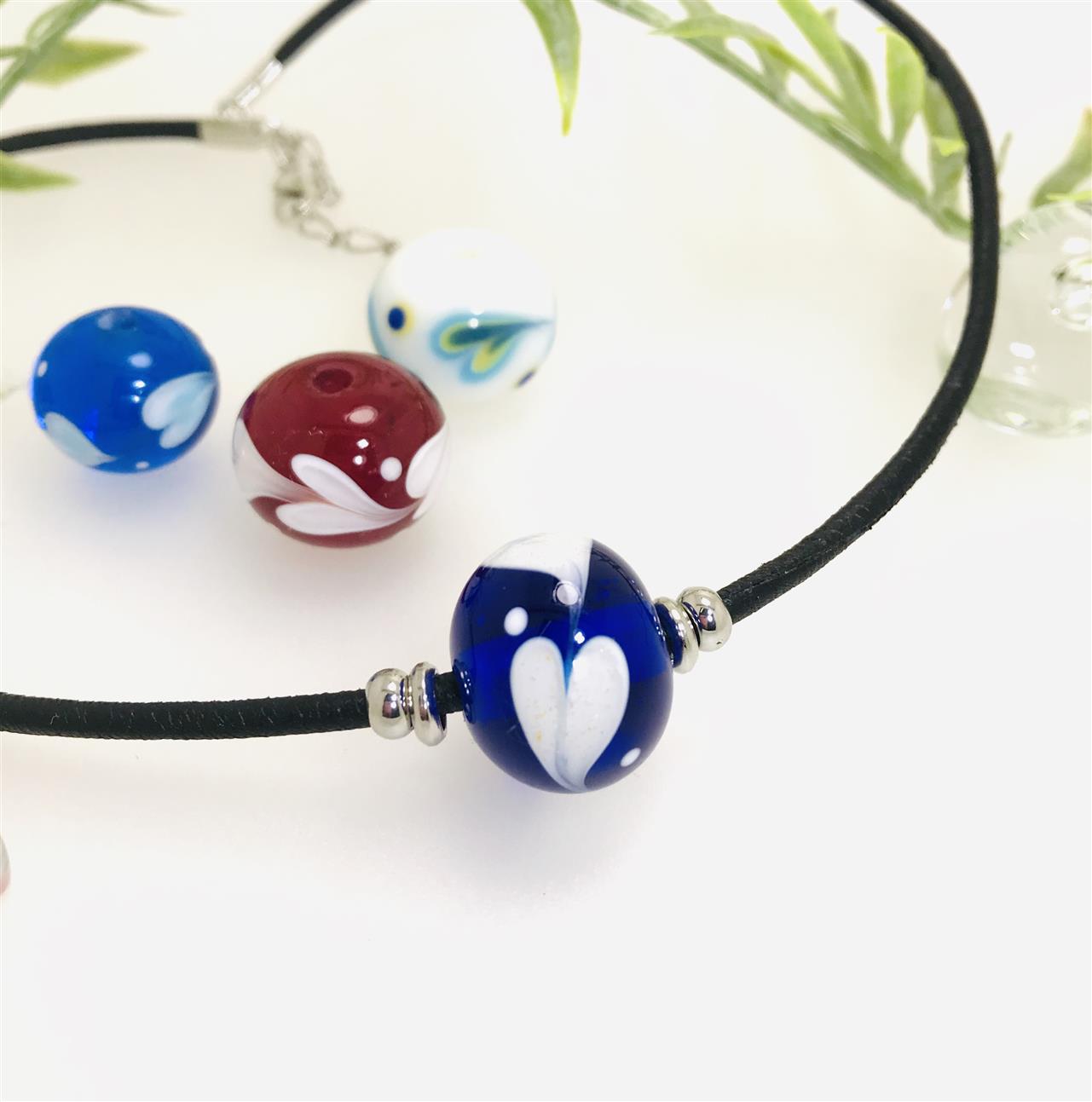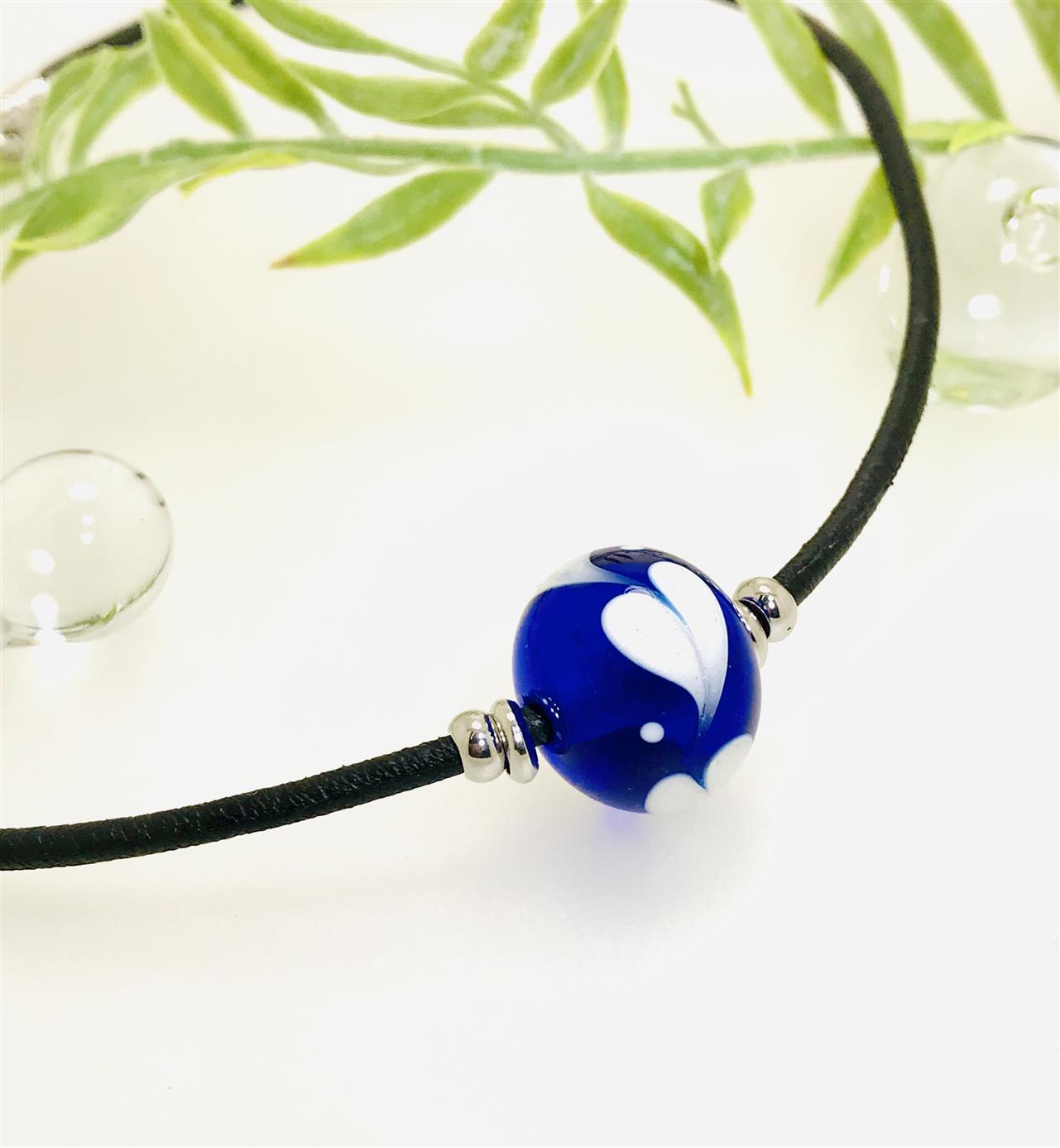 とんぼ玉体験メニューでも人気のひっかき。皮のチョーカータイプにするとシンプルでスタイリッシュな感じがお客様さまの目によく止まります。