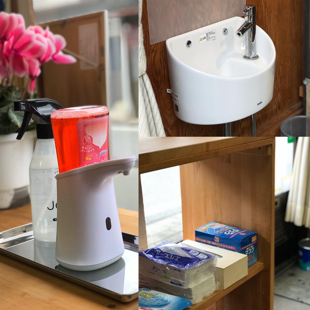 入り口で手洗い、マスクもご希望の方には無料でご用意しています。