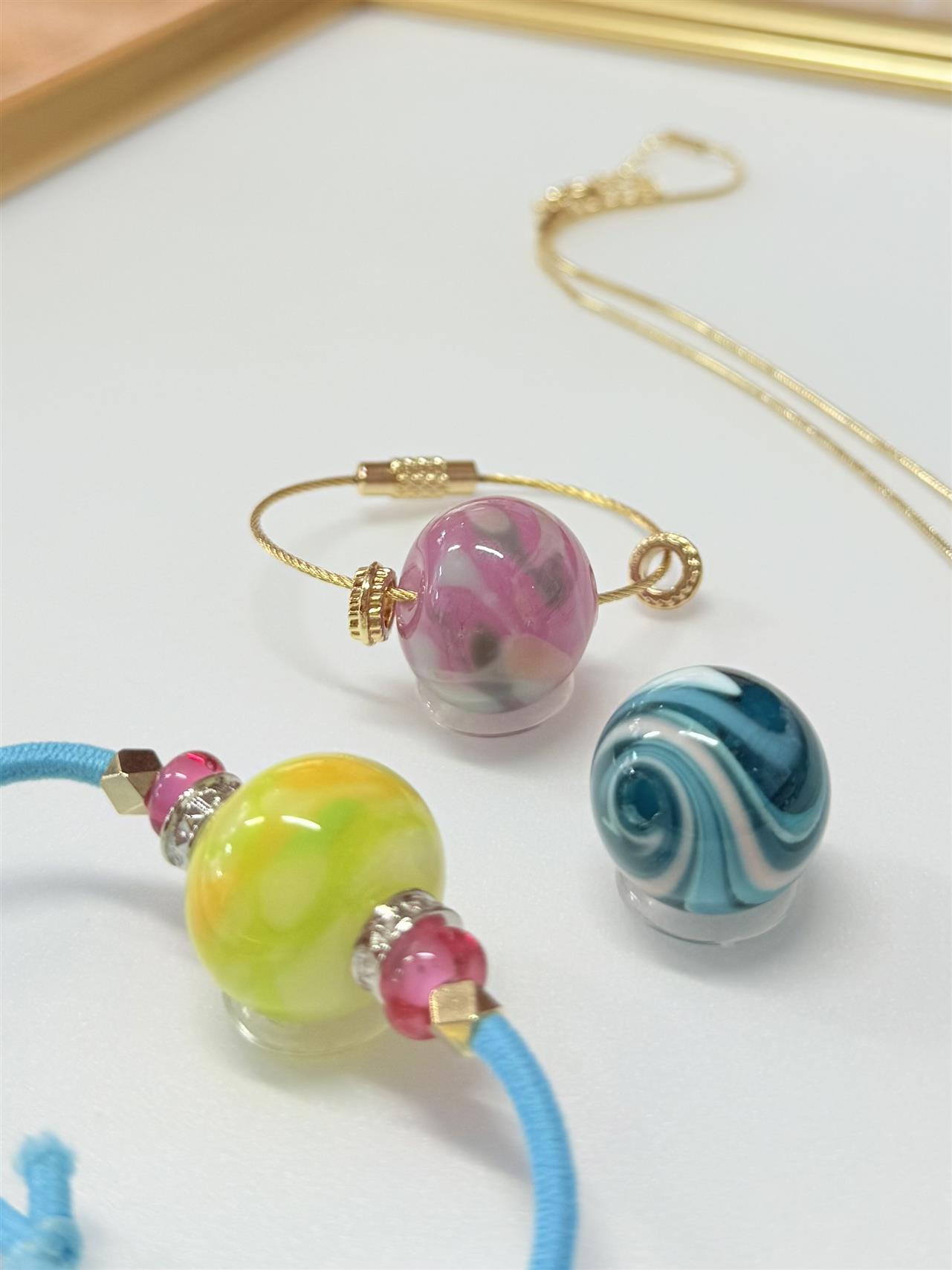 一緒に色を選びながら完成した作品は、鮮やかで世界にひとつだけのとんぼ玉。