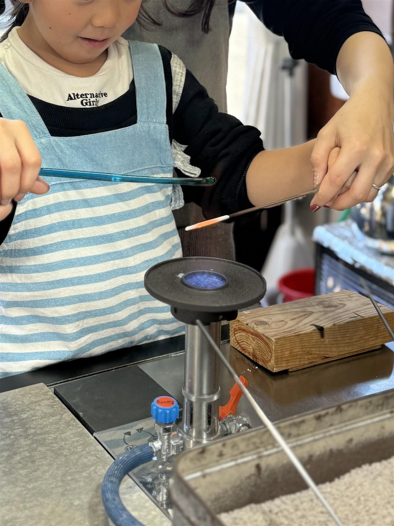 LAMP WORK TASUKUのとんぼ玉体験は、全員で一緒に楽しめる本格ガラス工芸体験です。