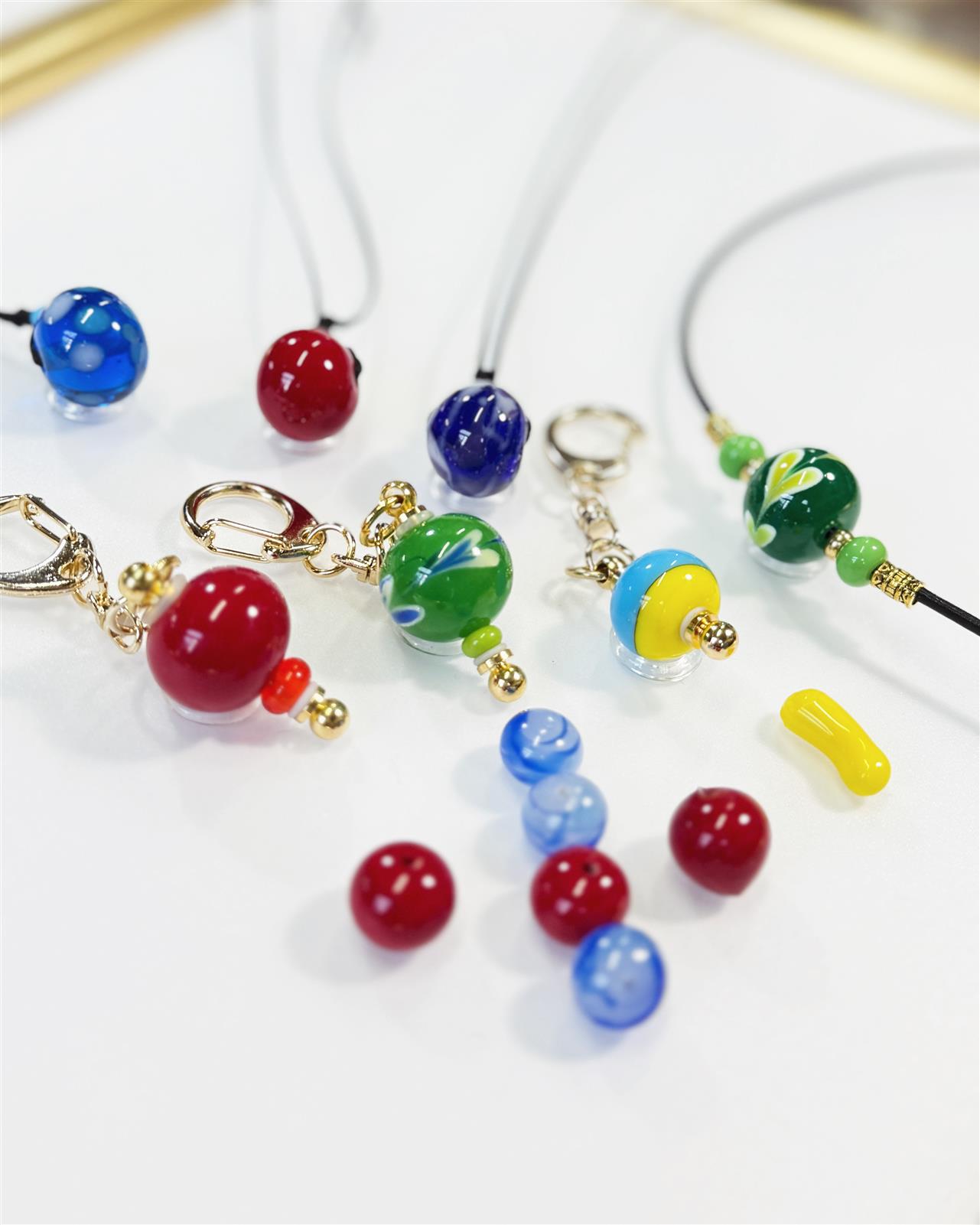 それぞれ想い思いのデザインのとんぼ玉を作った後、想い思いにガラスのアクセサリーにお化粧✨