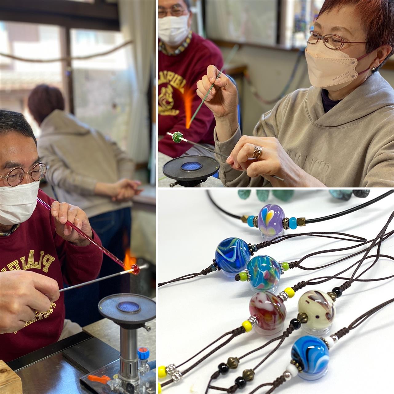 とんぼ玉作りはガラス棒をバーナーで溶かして巻き巻きしながら模様付け。