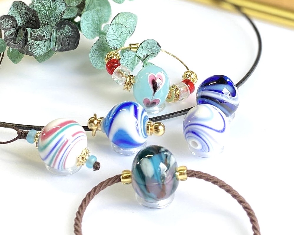 とんぼ玉は、色も形も同じものができないのが魅力の一つ。体験教室では、「世界にひとつ(一つ)の想い玉」として、ストラップやヘアゴムなどにして持ち帰ることもできます。