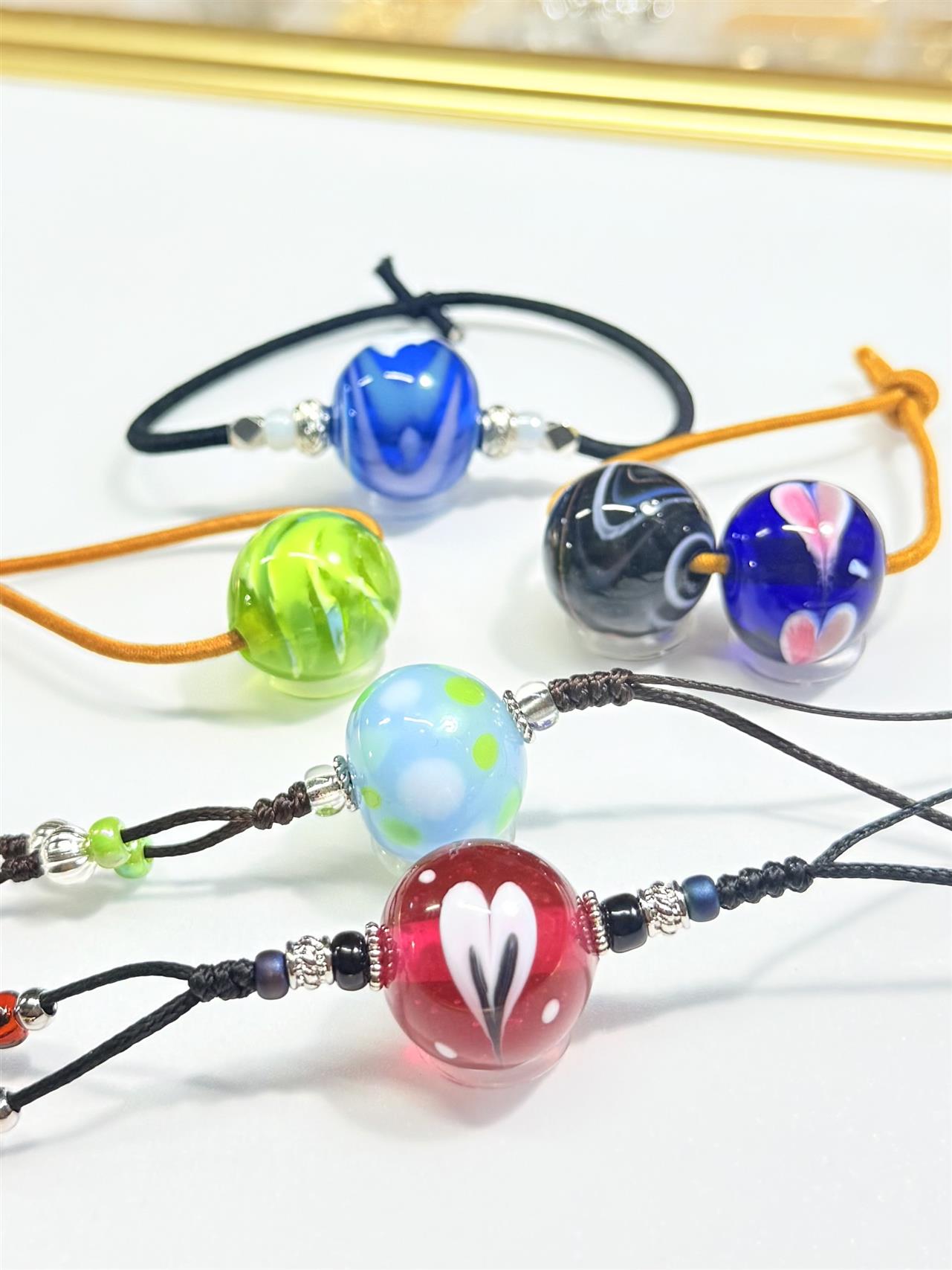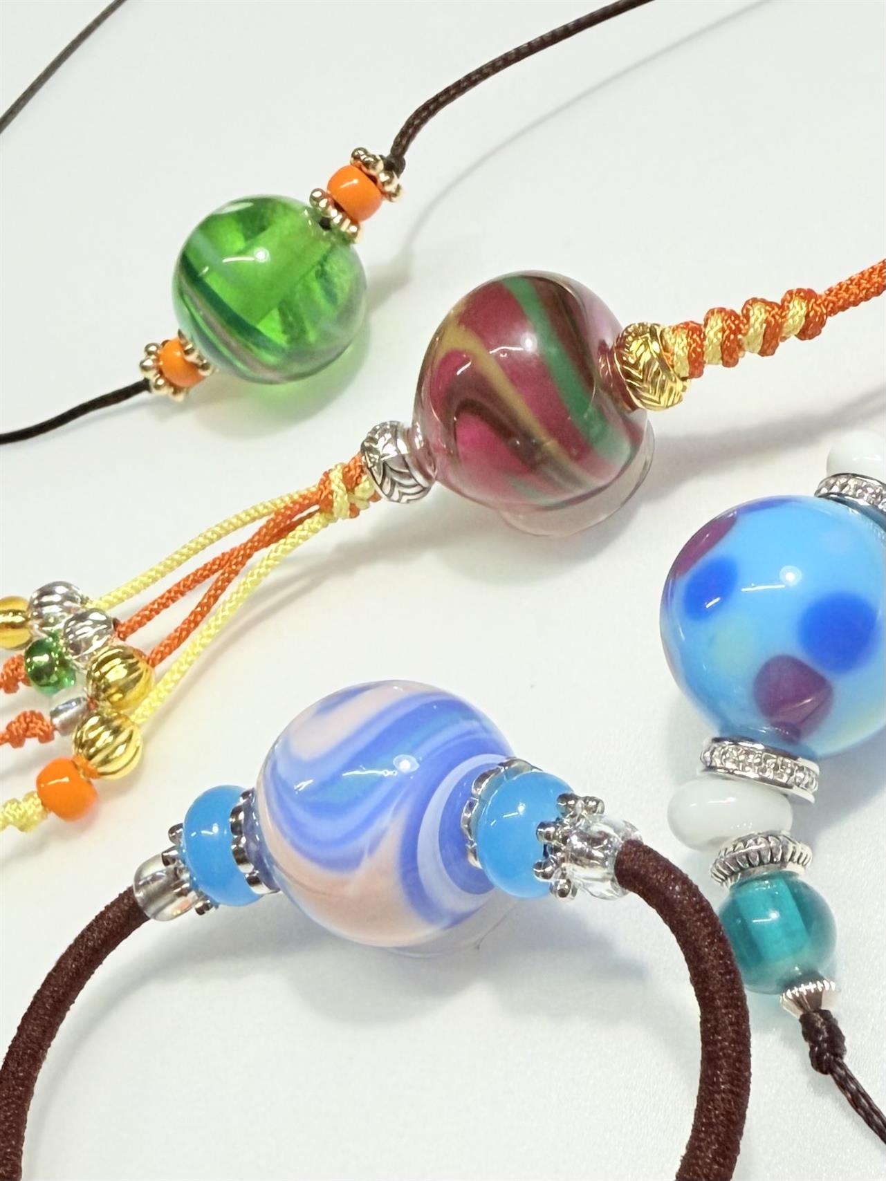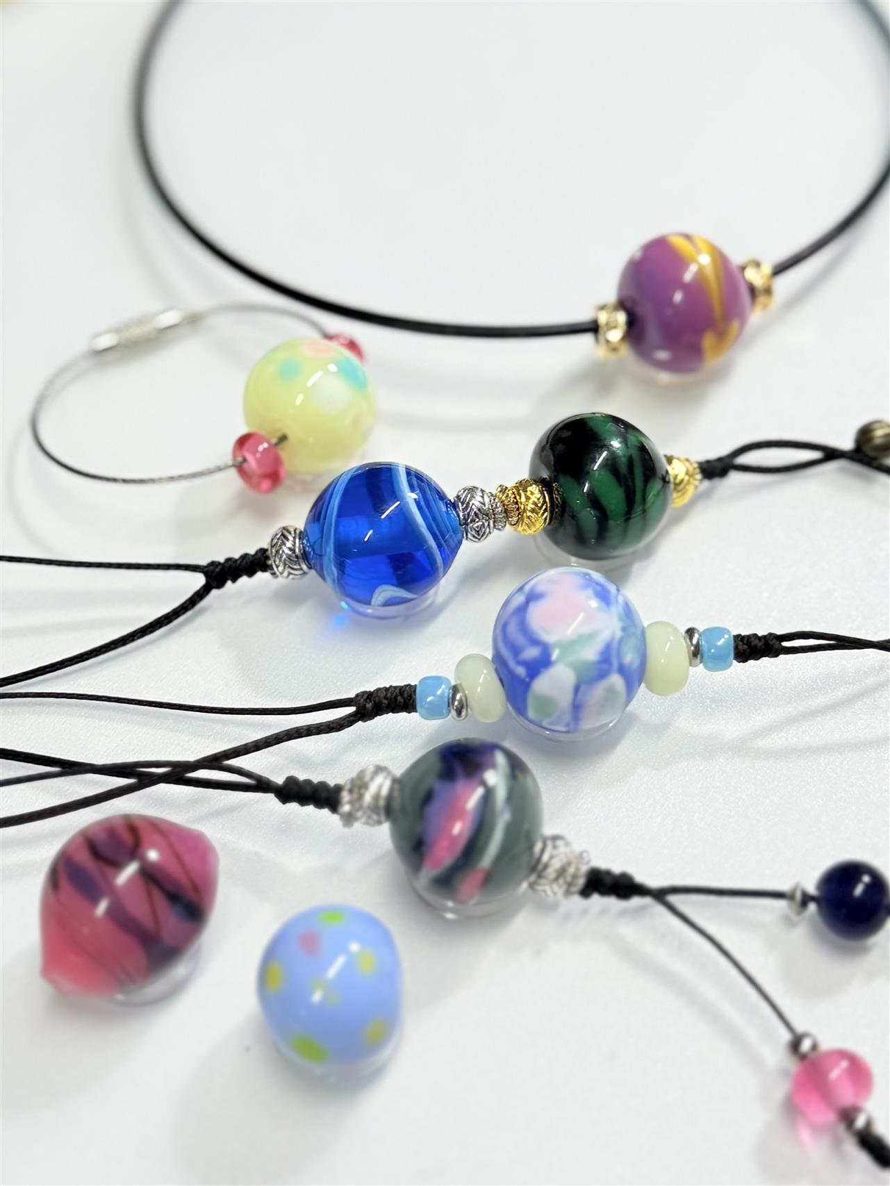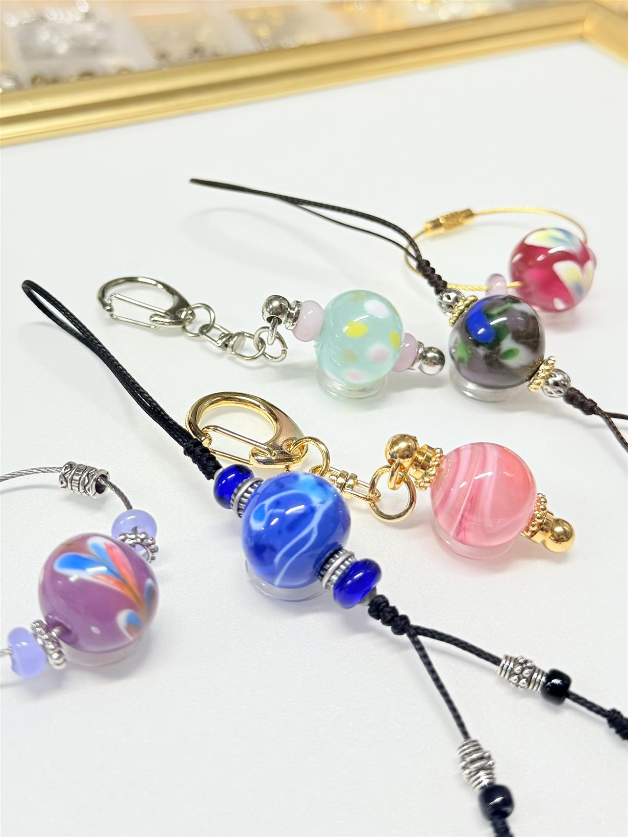 蜻蛉玉お守りストラップやネックレスに思い出の作品にお化粧して下さり、この子達と一緒にこれからきのさきへ!
