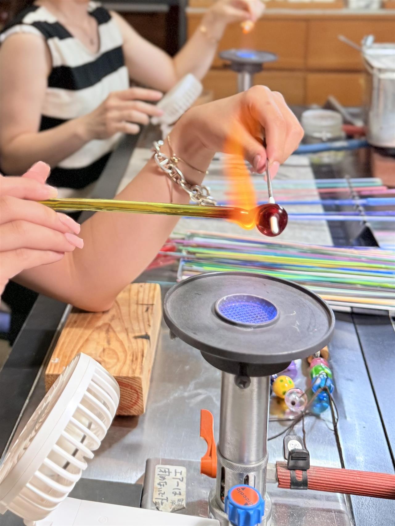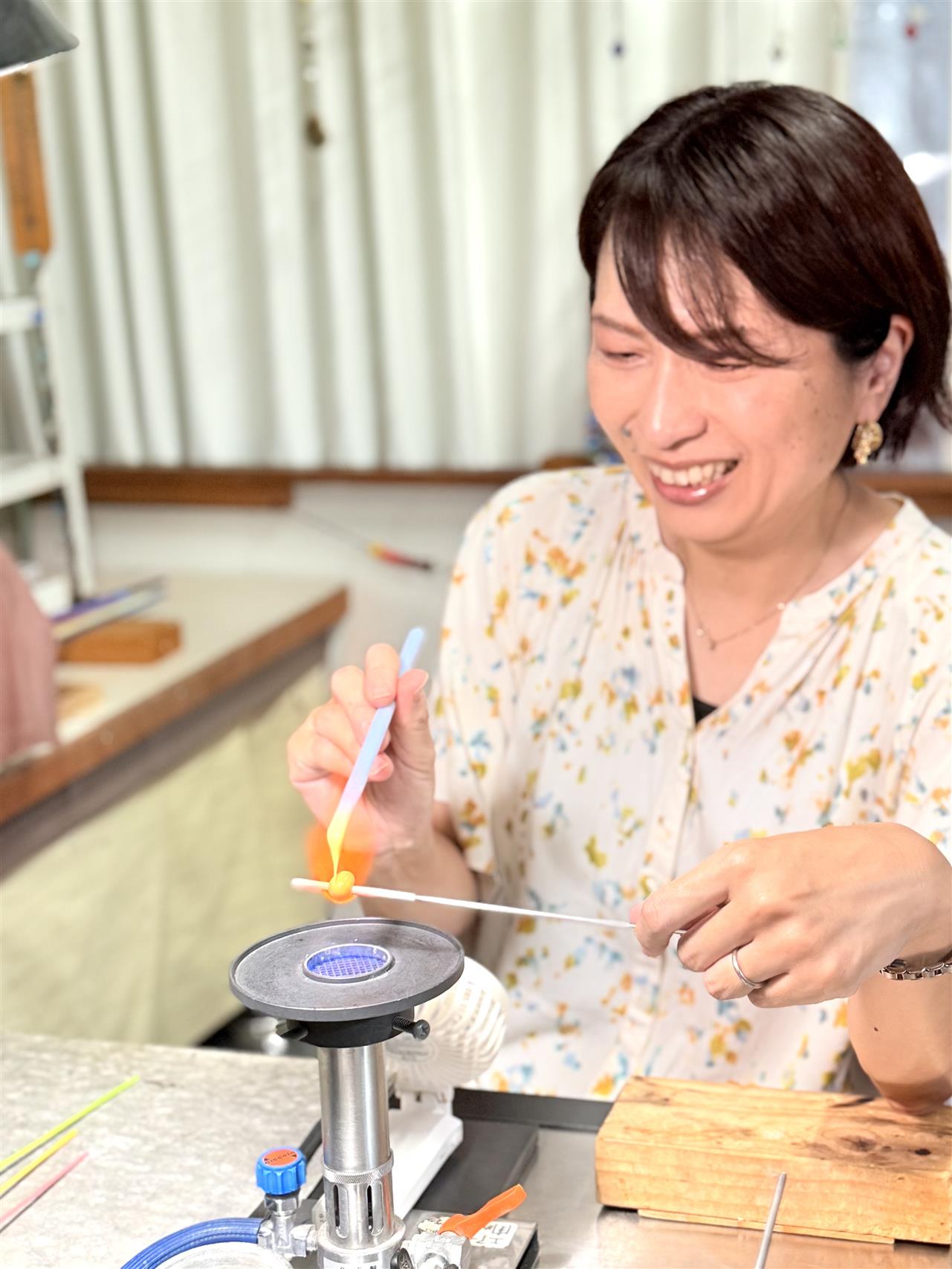 ランプワークタスクではたった1回かもしれませんが本格的なガラス工芸をとんぼ玉作りを通じて体験出来ます。